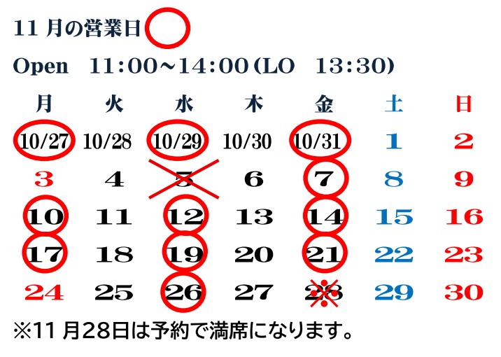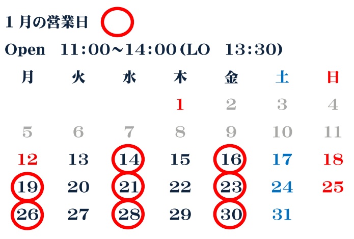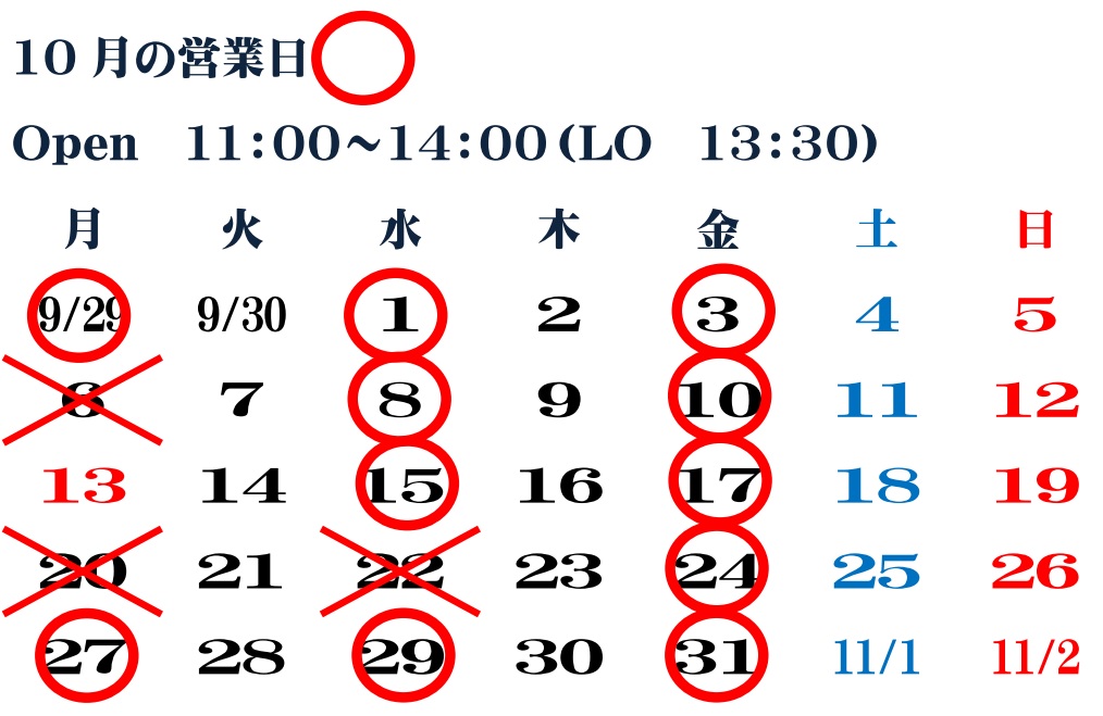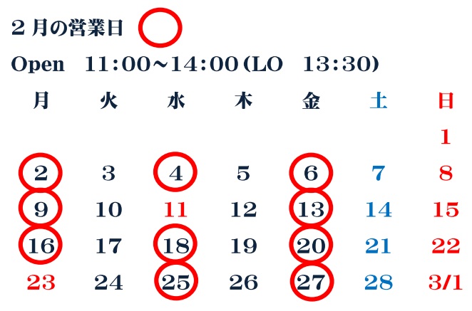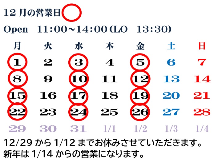 営業時間 11:00~14:00 (13:30までのご入店でお願いします。)